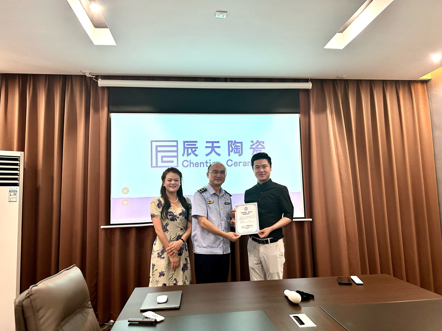 2023年8月25日下午,由景德鎮市市場監督管理局副局長、陶瓷協會秘書長林春杰頒發授予《“景德鎮制”新標識使用授權書》送至景德鎮市辰天陶瓷董事長高劍偉、總經理許婉手中,并指導新標識使用方法與規范。